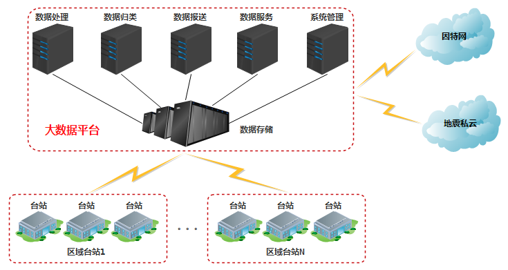从上述网络拓扑图可以看出,各台站通过通信链路将数据上传到大数据平台,并将数据汇聚存储到分布式云存储系统中,相应系统模块会调用分布式云存储系统中的数据进行预处理、数据归类、数据管理等功能,为后期数据的推送和服务搭建好基础平台。同时,大数据平台可以将体系内部的私有云接入到平台当中,也可以向行业用户、政府相关部门、公众等提供对外公共服务。